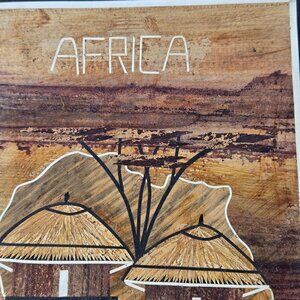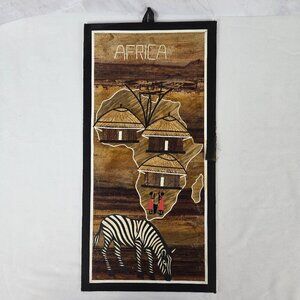 Set of 2 wall hangings are made from banana plant leaves and worked together to form the different textures and colors seen. Both pieces honor Africa and the life there with one highlighting a zebra and the other an African elephant. Loops at the top of the piece for hanging.