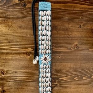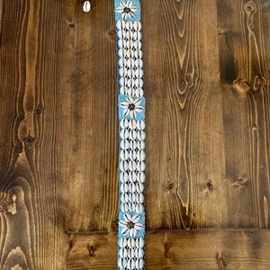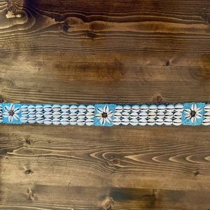 A one of a kind, beaded cowrie shell belt made with turquoise glass beads and shells and adjustable tie up cords.