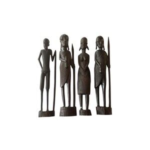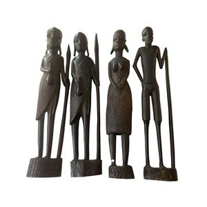 Lot of 4 Blackwood sculptures hand carved in Africa. The woman has a small flaw in lower leg. One of the men holding spear has a small crack that has been repaired. Free ground advantage shipping.