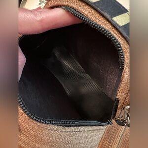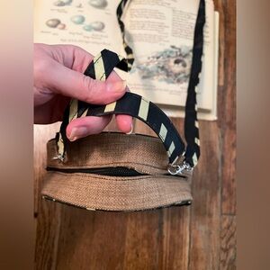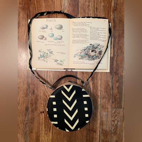 this is a really unique boho statement piece! round black and white chevron graphic fabric bag with hand strap & detachable shoulder strap, zip top and burlap-looking looking sides. haven’t worn. Purchased new by a friend in Cape Verde, Africa.