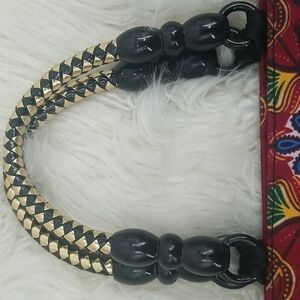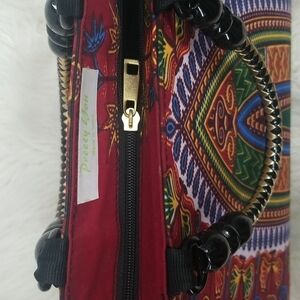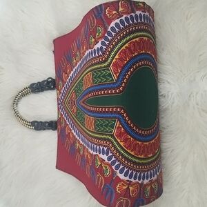 Beautiful Colorful African Tribal Ethnic Patterned Oversized Purse. Stiff Construction with Fabric Overlay and Beautiful Flexible Gold & Black Bead Handles. Definite Showstopper!!