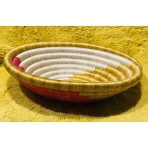 African Hand Woven Swirl Coil Wall Basket Natural Bowl 9” Pink Yellow Cream