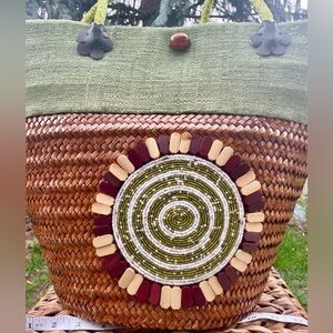 African Masai Mara Beaded Medallion Rattan & Sage Green Fabric Tote Bag