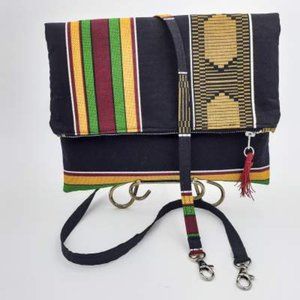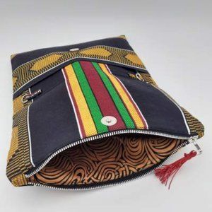 This African print fold-over Crossbody Clutch bag is beautiful, versatile, and one of a kind. There are so many features of this bag. Remove the strap to convert from a Crossbody bag into a Clutch bag. Two large pockets; one on the outside of the bag and one inside made from the contrasting black and gold swirl premium100% cotton fabric. Measurements: Fold-over open - 13", Clutch length - 8", Clutch width - 11", Strap 1/4" x 43", Zipper - 9" black metal, and Closure - Meta magnetic snap.