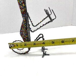 This handcrafted, beaded wire chameleon from South Africa, sculpture exudes a unique charm with its vibrant multi-color beads and intricate wire craftsmanship. Standing at 8.5 inches tall, it adds an artistic touch to any space. Its thoughtful design and striking appearance make it a captivating addition to both modern and traditional interiors.