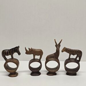 African Wood Carved Safari Animal Napkin Rings jungle theme Made In Kenya VTG