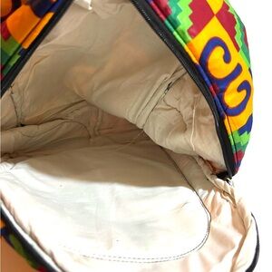 Vibrant backpack with geometric patterns. Features multiple colors including yellow, green, blue, and red. Perfect for school or travel. African unisex Ankara handmade with bold colors & patterns ideal for school work every day use the bag have 4 pockets to hold all supplies needed for the day adjustable strap hight 17” 13” depth 3” strap drop 41” adjustable