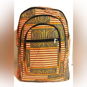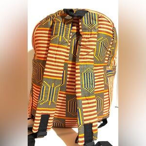 Vibrant backpack with a unique pattern. Features multiple compartments for storage. Perfect for everyday use. African unisex Ankara handmade with bold colors & patterns ideal for school work every day use the bag have 4 pockets to hold all supplies needed for the day adjustable strap hight 17” 13” depth 3” strap drop 41” adjustable