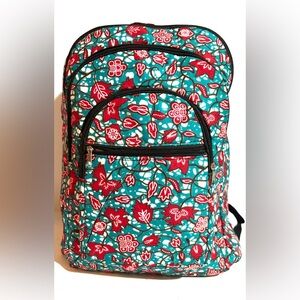 This vibrant floral backpack combines style and functionality, featuring a striking red and green design. Ideal for daily adventures. African unisex Ankara handmade with bold colors & patterns ideal for school work every day use the bag have 4 pockets to hold all supplies needed for the day adjustable strap hight 17” 13” depth 3” strap drop 41” adjustable