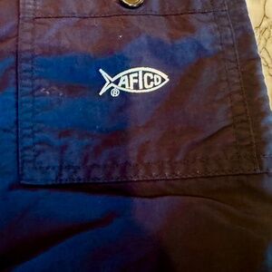 Black Aftco Youth Original Fishing Shorts size 26. Features stretch waistband, double stitched seams, embroidered fish logo, multiple pockets, Dupont Supplex 3-ply nylon.