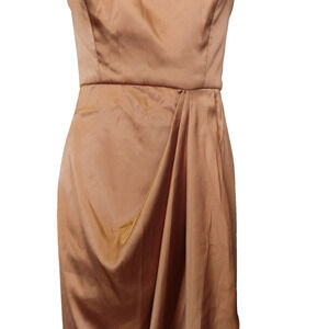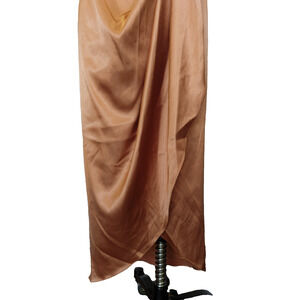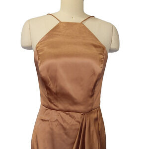 After Six toffee satin midi dress with square strappy neckline and tulip draped skirt. In gently preowned condition, no flaws noted.