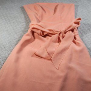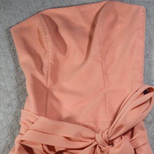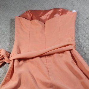 Adorable like new condition Peach Knee Length Formal Dress features Strapless design w/ side boning for extra support. Fully acetate double lined & nice chiffon bow. Center back zipper w/ hook-eye closure.