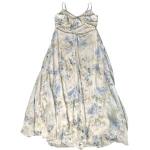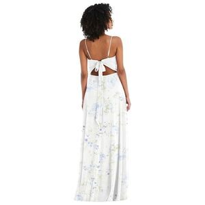 After Six Tie-Back Cutout Maxi Dress with Front Slit in Bleu Garden Floral (Blue/Sage on White Background). Lux Chiffon. Size 18, but please do see measurements as event dresses tend to run small. Brand new and never worn. New with tags.