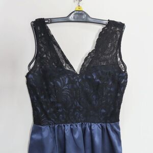 Cocktail length sleeveless party or bridesmaid dress lace bodice over matte satin with scalloped V-neck detail.