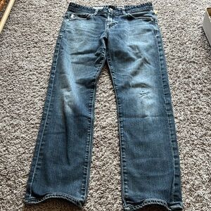 The Graduate tailored leg jean for men features a 14-year medium wash that’s been uniquely faded and whiskered to mimic a pair of genuine vintage jeans. The Graduate is cut in a slim mid-rise waist with a relaxed fit at the hip to the knee before tapering at the leg opening. This men’s slim-straight jean is designed in 10 oz. Daytripper Stretch Denim. These men’s jeans are very nice! The inseam of this style is 33” according to their website. They are distressed at the knee and the pockets in the back (with a small hole). See all photos before purchasing and ask any questions below.