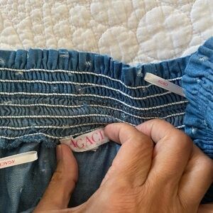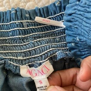 A’GACE 3/4 sleeves off shoulder blouse size small in blue pre-ow 100% cotton boho style in excellent pre owned condition no signs of tear, discoloration or stains kept in a non smoking home