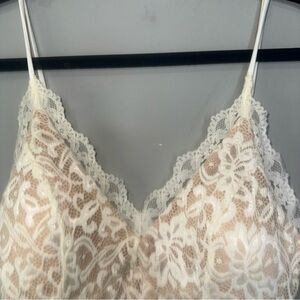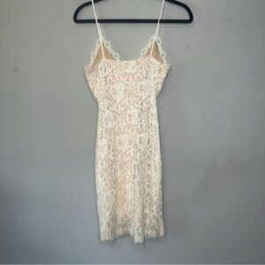 This is a delicate lace overlay slip dress from A'GACI, featuring a floral pattern and adjustable straps. The dress is medium-sized and made in the USA, perfect for a casual or semi-formal occasion.