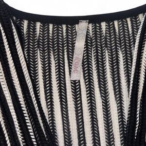 Black and white striped mini dress with V-neck and short knit sleeves.