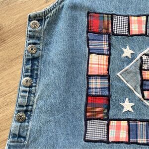 vintage denim dress, 90s denim dress, patchwork dress, midi denim dress, sleeveless dress, American flag dress, Americana style, patriotic dress, retro fashion, country western, rodeo outfit, festival style, Y2K vibes, 4th of July outfit, summer dress, statement dress, casual cotton dress, concert outfit, rare vintage find, cottagecore denim, reworked look, unique vintage