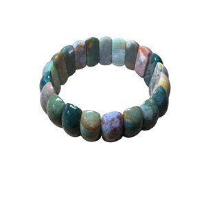 This beautiful stretch bracelet is made from polished agate bloodstone beads, each shaped into smooth rectangular tabs that form a bold, earthy band around the wrist. The stones display a natural mix of deep greens, rusty reds, warm ambers, and cool slate tones, each bead unique with its own marbled patterns and color variations. Known as bloodstone agate or heliotrope, this stone is often associated with grounding, strength, and protective energy. The bracelet has a substantial feel while still being comfortable for everyday wear. It measures approximately 9". In excellent condition.
