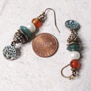 I created a gorgeous bead stack for this set - in beautiful bronze, green and rust fall colors! Several stacked bronze dividers and beads are the base of this bead stack, topped by green Agate Rondelles, a white pearlized Glass Bead [durable faux pearls] and topped by a softly orange-y russet colored, round Carnelian bead. For a bit more visual interest, I added a small, bronze patina painted "Tree of Life" charm. All hardware is non/low tarnishing bronze, and that includes the earwires.