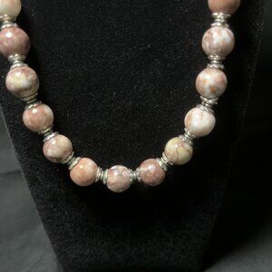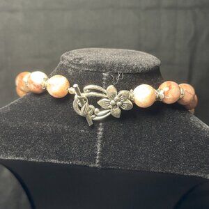 Beautiful agate necklace with varying shades of brown, cream, tan and white. Silver toggle clasp and silver spacers between the round agate stones.