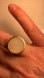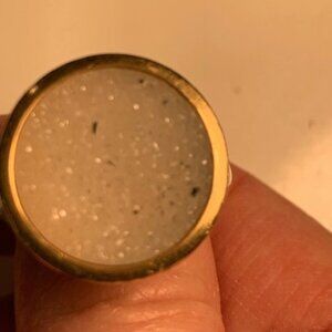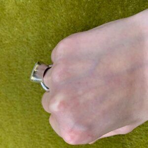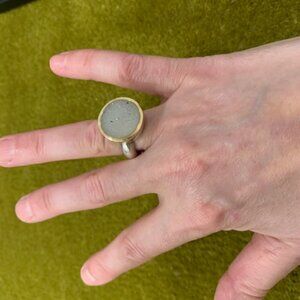 Size 6 ring by Gudrun Meyer, an artist working in Bochum, Germany. Agate crystal in in sterling silver band with 18K gold bezel. Gudrun’s distinctive maker’s mark is within. The diameter of the circular “face” of the ring is 13 mm, with the crystal itself occupying 10 mm. It is staged on a 7 mm high “cup” (see sideview in photo #5). The silver band of the ring is pleasingly curved (this is a comfortable ring to wear/fiddle with), and 4.5 mm in width. It has heft but is not heavy. Overall weight is 13.7 grams.