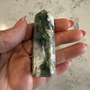 Beautiful gray and white agate tower. Perfect for decor or meditation. Just a little over 2 3/4 inches