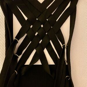 "Elevate your wardrobe with this stunning black knit dress crafted from luxurious 100% soft Merino Wool. The fabric features a comfortable, flattering rib-knit texture and a classic V-neck front. The simple front allows the back to make a dramatic statement: a bold, open criss-cross cage strap design, secured with chic gold-tone rings on the side seams.