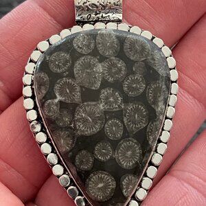 Pendant of a black and gray coral fossil stone in a 925 silver plated setting with a tube bail.