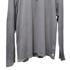 This Agave Denim pullover sweater is a solid gray color with a mock neck and long sleeves. It features a 1/4 zip and is made of lightweight cotton material. The sweater has a regular fit in size XL and is machine washable. Perfect for winter, fall, and spring, this stylish Henley style sweater is ideal for walking or casual activities.