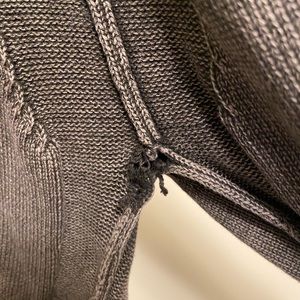 Deconstructed and industrial in a charcoal/slate color, this fits nicely on 6’3” 185. Arms are nice and long. The fabric is a highly textured rough cotton with some tearing across the v-neck a design element. There is a small hole in one of the armpits which kind of just fits the vibe. Some design elements and the hole are highlighted in pics. This pairs well with a black leather jacket.