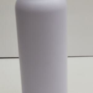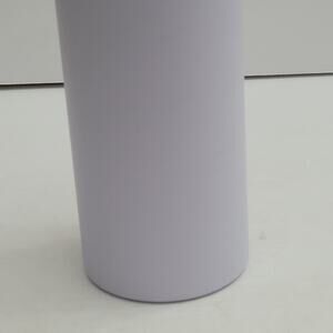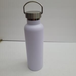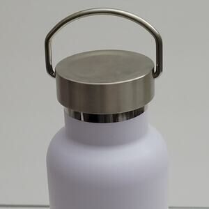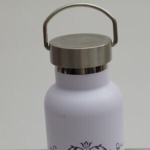 This is a light purple insulated water bottle, likely made of stainless steel, featuring a silver-colored metal lid with a convenient carrying handle. The bottle is adorned with a decorative graphic and text that reads, "NOT A DAY OVER Fabulous."