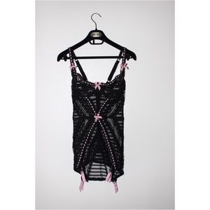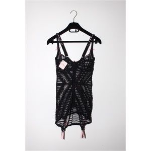 Krystalana is a retro confection of lace and stripy mesh, with all the lines of the corselette and the roll-on suspender converging at just the right points. Panels of striped French Leavers lace and stretch stripe tulle create this contouring range. Pale pink ribbon slot and candy stripe bows prettify the sheer black look. Original Price $590.00