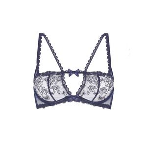 The Agent Provocateur Rosa bra in midnight navy features cut-out effect scallop-edges, embroidered lace double-straps, floral embroidery on sheer tulle and matching bows to boot.