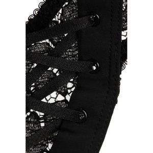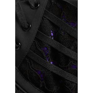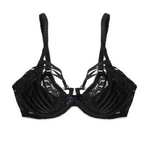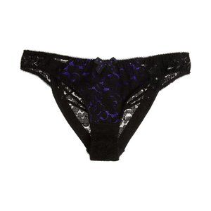 Agent Provocateur's 'Rudy' set: bra, briefs and suspender belt are crafted from artisanal Leavers lace from esteemed French heritage brand Sophie Hallette. This purple silk-paneled style is trimmed with satin-jersey and detailed with eyelets and elasticated crisscross straps.
