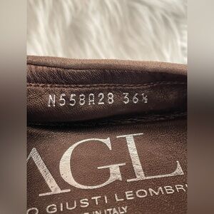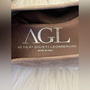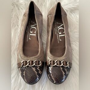 AGL flats, taupe shimmer with snakeskin toe and silver hardware. Worn, in good condition. Originally $325.