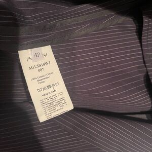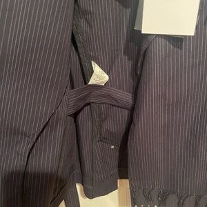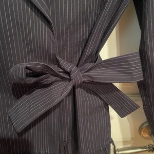 Chic navy pinstripe blazer featuring elegant studded accents. Tailored fit with a stylish tie waist. Ideal for a polished look. Does say size 42 which is a xl… but I would say it’s more of a large than an xl. Does have small shoulder pads. The blazer is stunning.