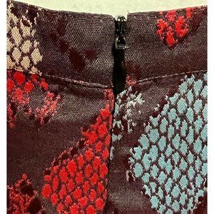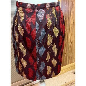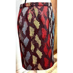 This is an Agnes B. skirt (Made in France). Absolutely gorgeous, colors are reflective and vibrant. Tag says Size 40, Comparable to a 8/10. Skirt has a back zipper, walking slit, and is lined. Measurements: Waist: 30"; Length: 19" In Excellent Condition.