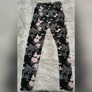 Elegant black leggings with pink floral pattern. Soft and stretchy fabric. Ideal for casual outings.