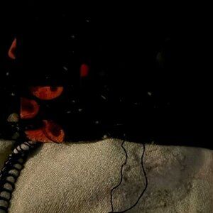 This is made from a thicker material not sure if it's Modal. In good worn condition. One small spot on the bottom seam that has unraveled but can be repaired easily by hand sewing a stitch or two. Other than that it's gently worn. Machine wash. From a smoke free and pet free home. I loved wearing this for the holidays and have to part with it as it no longer fits. I took a few measurements and put below. Fits true to size and made to not be snug.