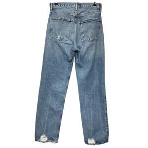 Agolde '90S' Blue Cotton Mid Rise Loose Fit Jean Size 25: button fly, 5-pocket styling with distressed detail at pockets, rigid denim fabric.