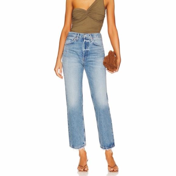 Chic straight leg jeans by Agolde. Light blue wash. Perfect for versatile styling.