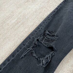 Cropped jeans with ripped / distressed / busted knee design and button fly. Likely fits cropped / ankle length depending on height. Fabric does not have stretch. Brand sold on Revolve
