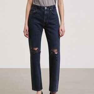 These Agolde jeans capture vintage nostalgia with a modern fit. Featuring the iconic 90s Pinch Waist silhouette, they offer a high rise, rigid structure, and a straight leg in a faded-indigo wash. Distressing on the knees. Crafted from 100% organic cotton and made in Turkey, these are a size 25.