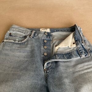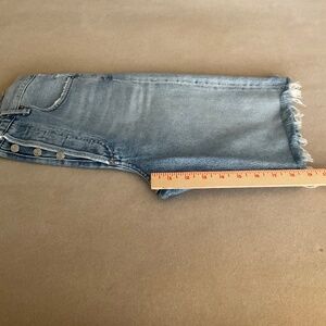 Made from regenerative cotton and vintage light indigo denim. Have subtle fading a raw hem. Button fly. Rare find! Inseam 9”, rise. 12”, leg opening 20” used in excellent condition..