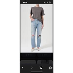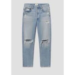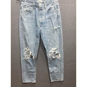 The Agolde 90s Mid Rise Loose Fit Jeans in women's size 28 (30x29) are a stylish and versatile denim staple. With a relaxed fit and button fly closure, these jeans offer both comfort and style. The light wash and solid blue color make them easy to pair with any top, while the 5-pocket design and mid-rise cut give them a classic look. Made from a cotton blend denim, these jeans are machine washable for easy care. Perfect for any season, these AGOLDE jeans are a must-have for those embracing the retro and hipster trends of the 80s, 90s, and Y2K era.