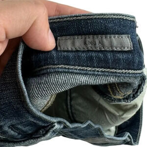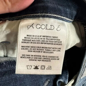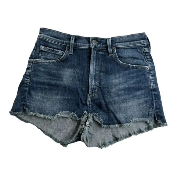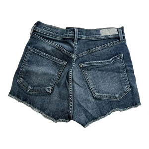 Agolde denim shorts, size 26. Style: Anja. Medium wash blue denim. High rise; high waisted. Raw, frayed hem. Notched/side split hems. Cut offs. Lightly distressed. Stretch; stretchy. Zipper and button fly closure. Spring. Summer. Beach. Casual. Streetwear. Outdoor. Boho. Festival. Hippie.