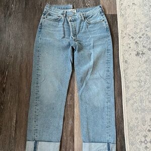 Agolde Light Wash Denim, Asymmetrical, Button Up, Cross Button, Denim, Size 30, Tailored, Contemporary, Chic, Classic, Cuffed Pant Leg