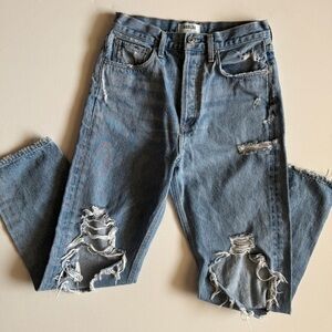 These Agolde straight leg jeans in a classic blue hue feature a high-waisted design and a vintage-inspired distressed finish, perfect for a relaxed, stylish look.